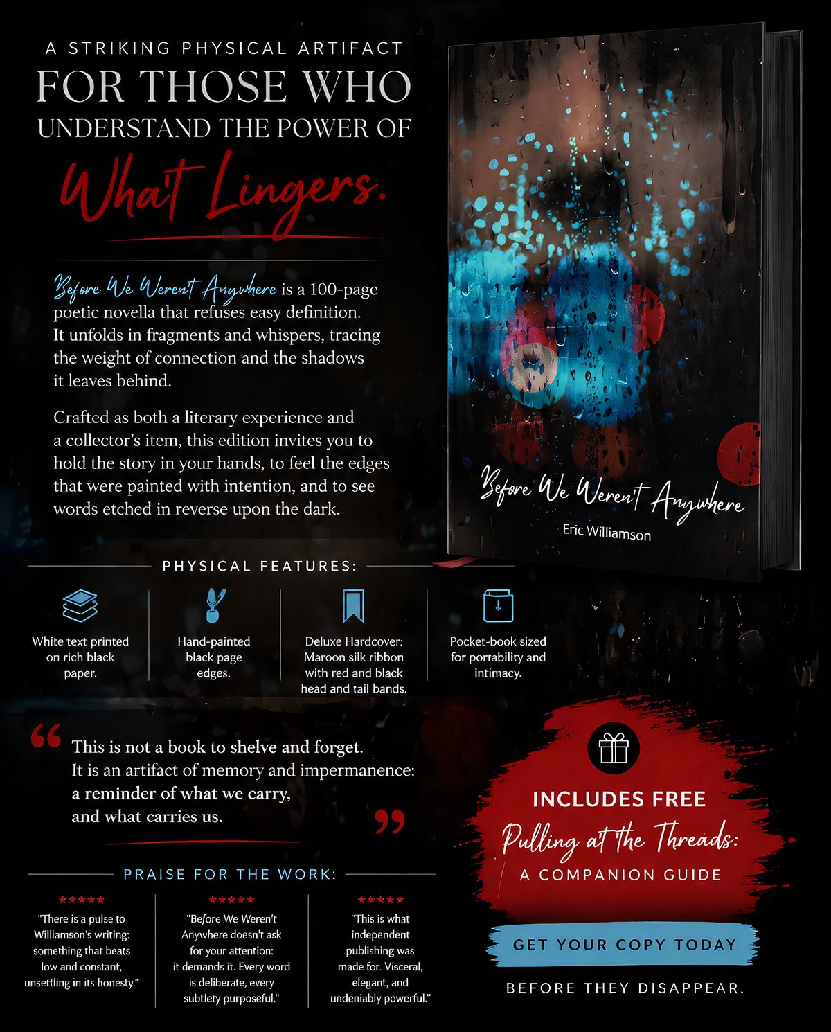 Before We Weren’t Anywhere is a 100-page poetic novella that refuses easy definition. It unfolds in fragments and whispers, tracing the weight of connection and the shadows it leaves behind. Crafted as both a literary experience and a collector’s item, this edition invites you to hold the story in your hands, to feel the edges that were painted with intention, and to see words etched in reverse upon the dark.